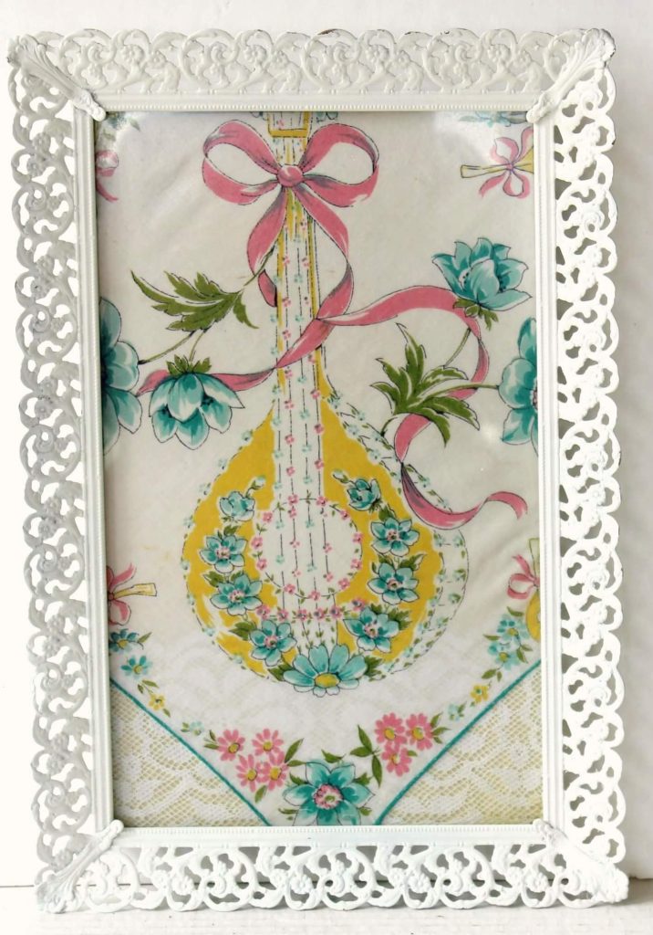 Lastly…I am displaying a vintage hankie in an old metal frame. I found the frame on the floor of a dark dank wooden closet at the Tiny Estate Sale.