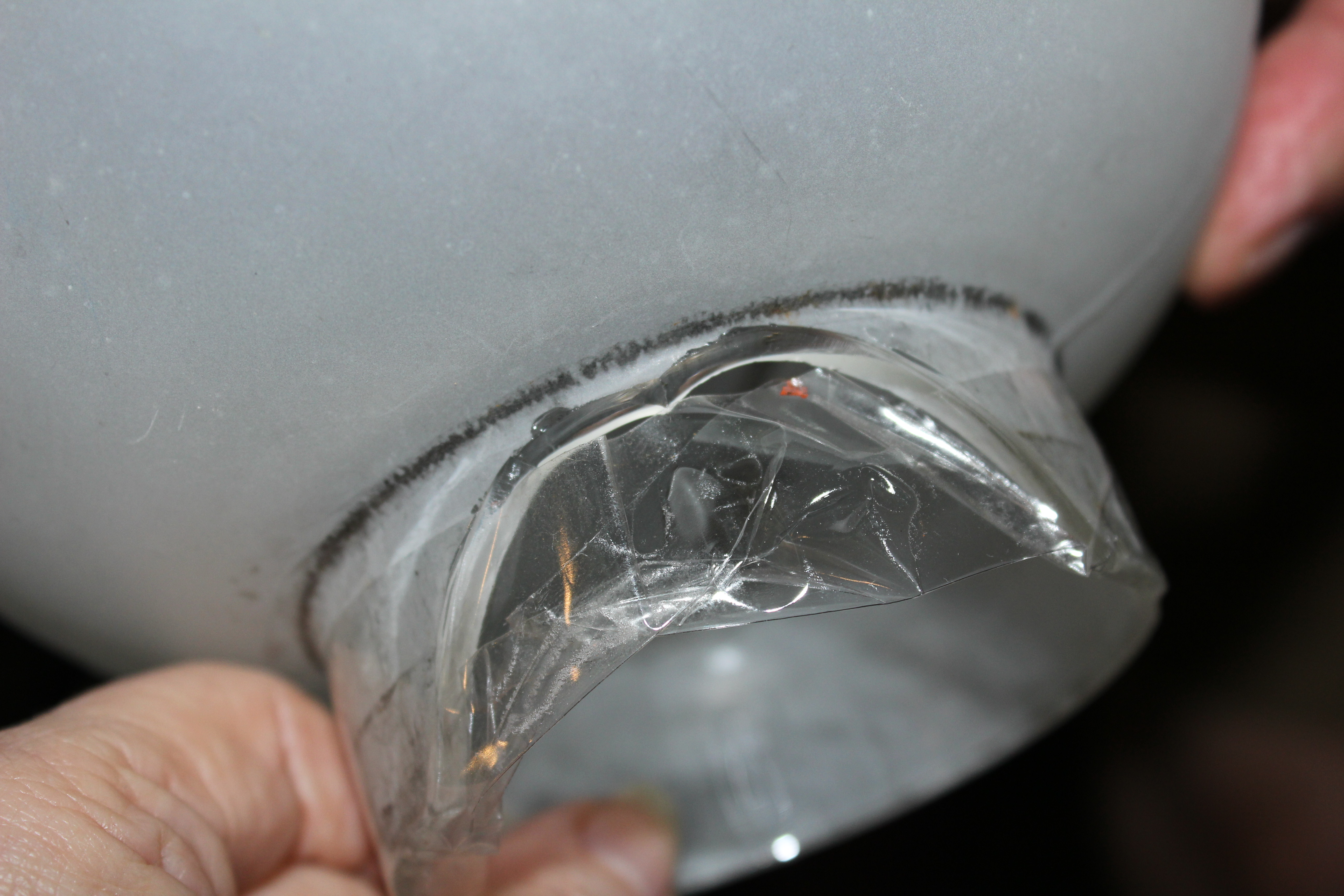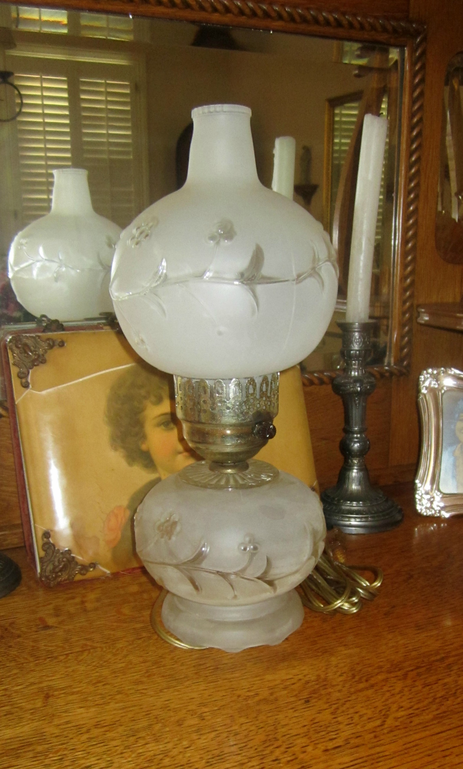 The frosted vintage hurricane lamp came from a rummage sale. Examining it closely to discover why it was so cheap at $2, I discovered AFTER I got home~I may have just inherited a new lamp…I’m not so sure it will sell with this much damage…what do you think?